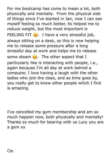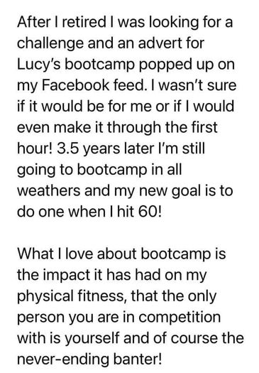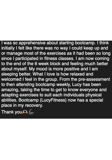 “Absolutely fantastic boot camp. Fabulous highly trained motivational teacher who gets the best out of her students. Couldn’t recommend Lucy’s boot camp enough. I just can’t wait for the next 6 week block 👍👍xx”