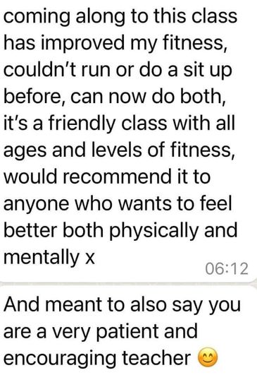 I appreciated how you tailored each exercise to suit the individual and as someone approaching their mid sixties I definitely felt part of the group. Thank you for all your help and encouragement.”